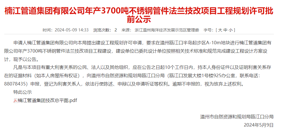 5月9日,溫州市自然資源和規(guī)劃局甌江口分局就楠江管道集團(tuán)有限公司年產(chǎn)3700噸不銹鋼管件法蘭技改項(xiàng)目工程規(guī)劃許可進(jìn)行批前公示,公示期:10個(gè)工作日。